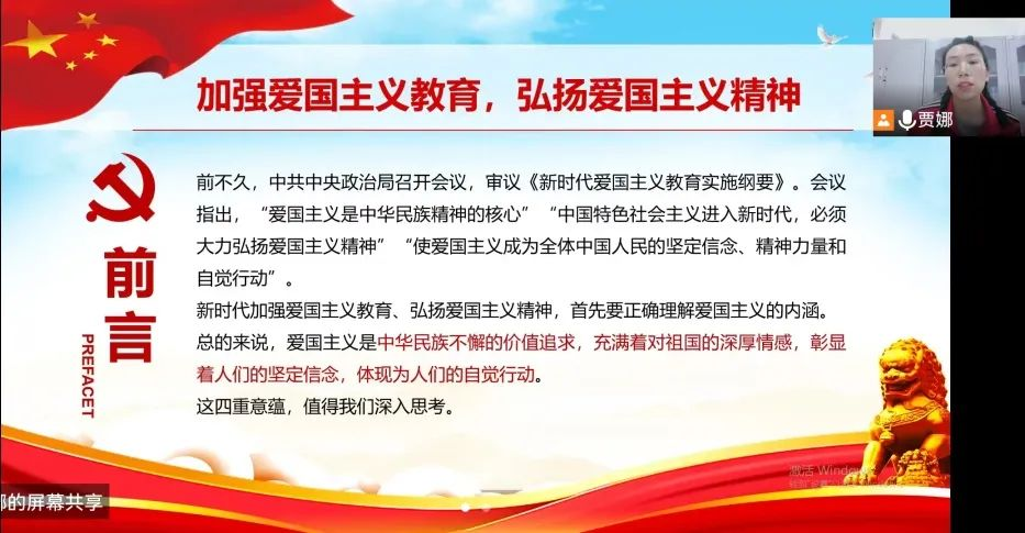 为大力弘扬爱国主义精神,传承中华民族传统美德,确立理想信念,规范文明行为,提高基本素质,在疫情防控期间,深入贯彻落实爱国主义思想教育,yl23411集团于2022年5月1日利用腾讯会议线上开展“同上一堂爱国主义教育思政课”活动。学生党支部书记贾娜老师主讲,全体大一同学参加。