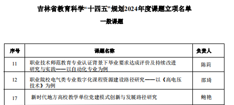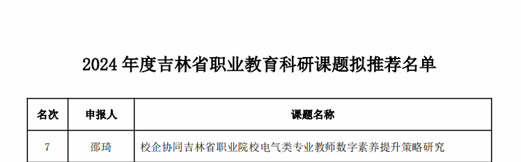 同时,邵琦老师的《校企协同吉林省职业院校电气类专业教师数字素养提升策略研究》课题被推荐为2024年度吉林省职业教育科研课题立项。