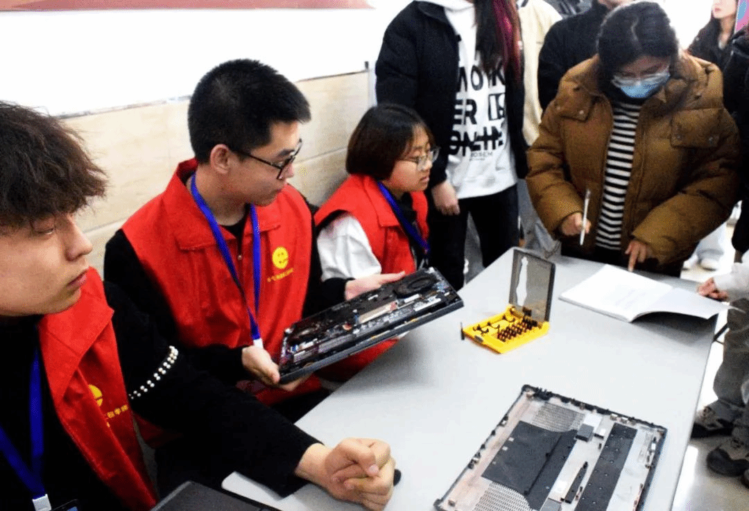 活动现场,电子科技协会的志愿者们热情满满、分工明确。他们熟练地打开一台台电脑,仔细清理风扇、散热片等部位堆积的灰尘,电脑中的灰尘长期积累,不仅影响散热,还可能导致运行速度变慢甚至出现故障问题。