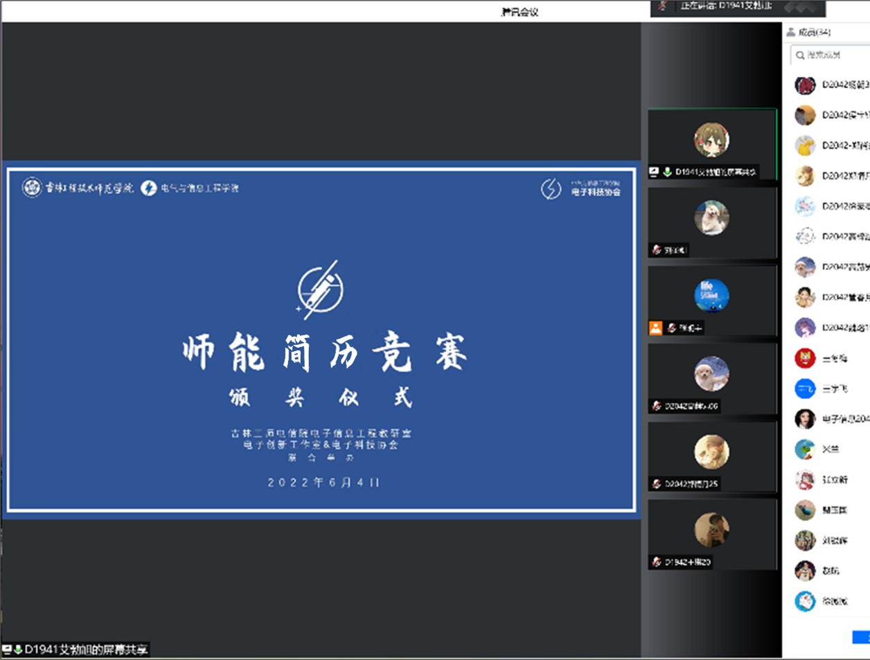 为对以上成员进行嘉奖,简历比赛组委会于2022年6月4日举行了线上颁奖仪式。其中,电信院电子信息工程专业教师吉李满、邵丙新、刘佳、徐微微、刘险峰、张立新、赵航、王宇飞、刘银辉、裴玉国、王冬梅、范珩、张明宇等13名教师前来出席本次颁奖仪式,在仪式上宣读了获奖人员名单,并对其致以祝贺。