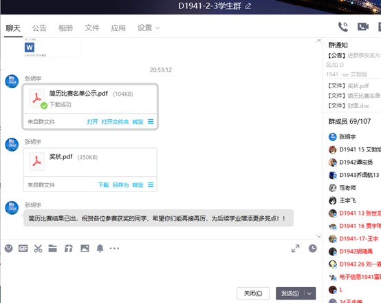 简历比赛一经开始,即受到了来自电子信息工程专业学生的大力支持,共计有50余名同学积极踊跃报名参赛,涵盖电子信息工程19级各个班。经收集参赛学生作品进行审核,并聘请专家评委老师对审核达标的作品进行评审给定分数,在最后综合各方面因素平均排名后,评审出6名一等奖、8名二等奖、20名三等奖。